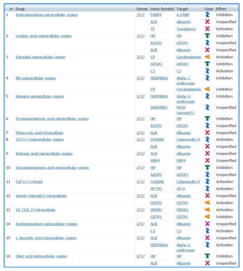 Following this suggestion, we also performed a bioinformatic analysis on MetaCore software by the tool “Drug look up for your data” visualizing specific drug molecules (Figure 5) related to the differential proteins reported in Table 1, and considered a potential target of treatment. Most of the reported drugs are molecules acting on metabolic and hormonal pathways such as androstanolone, linoleic acid, estradiol, nitric oxide (NO), etc.