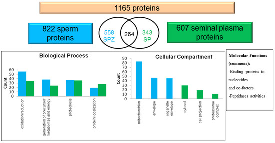 Respective composition of rooster plasma seminal and sperm proteins. Among the 1165 proteins observed by LC-MS, 22.6% were common to sperm (in blue) and seminal plasma (in green). The same general biological processes were found in both but cytosol products and components of proteasome were mainly extracted from seminal plasma [19].