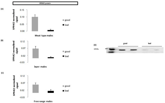 Li et al. [23] found higher amounts of seminal SPINK2 in low motile sperm of the indigenous chicken breed Beijing-You. Considering that SPINK2 is an acrosin/trypsin inhibitor, protecting the sperm against damage by binding to the sperm membrane, these authors suggested that its greater abundance might be related to the failure of SPINK2 to bind to the membrane and acrosome of damaged sperm [23].