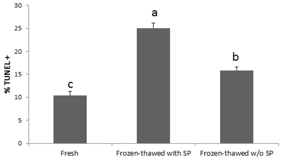 Percentage of chicken sperm TUNEL + (DNA fragmentation assessed by terminal deoxynucleotidyl transferase dUTP nick end labelling) in fresh sperm and after freezing-thawing samples (n = 90) with or without (w/o) seminal plasma. Different letters (a, b, c) indicate significant differences (p < 0.05).
