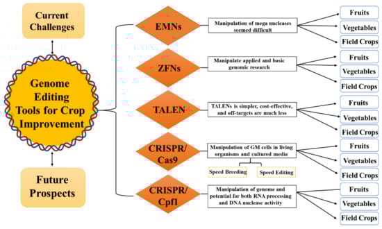 Extensive investigation in this field led to the development of new genome-editing tools, such as CRISPR/Cas9 and CRISPR/Cpf1 [,]. Initially, these techniques were developed in prokaryotes, because there were no efficient genome-editing techniques for eukaryotes at specific sites. However, at the advent of eukaryotic genome editing, the CRISPR technology has revolutionized our ability to generate specific changes in crops []. The CRISPR system requires only the guide RNA sequence to be changed for each DNA target site. Under different circumstances, the usage and modification of CRISPR technology are quite simple and efficient [,]. In this review, we highlight the use of genome-editing techniques to achieve highly precise and desired modifications in plants, as well as examples of the application of EMNs, ZFNs, TALENs, and CRISPR/Cas9/Cpf1 in various plants (Figure 1).