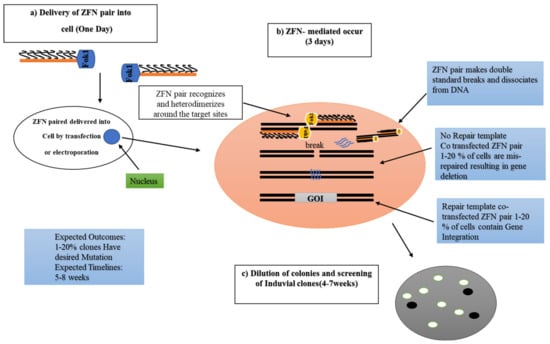 Processes of Zinc-finger nucleases (ZFNs). (a) Delivery of ZFNs into cells by transfection or electroporation. (b) ZFNs are fusions of the nonspecific DNA cleavage domain of the FokI restriction nuclease with zinc-finger proteins. ZFN dimers induce targeted and double-stranded breaks (DSBs) to stimulate the DNA damage response pathways. The binding specificity of the designed zinc-finger domain directs the ZFN to a particular genomic site. The boxes with blue color represent the mechanism of the ZFN genome-editing technique. (c) Cloning of ZFN-genome-edited cells and screening of positive clones by RT-PCR and sequencing analyses. This figure briefly modified from the source (https://www.sigmaaldrich.com/technical-documents/articles/life-science-innovations/targeted-genome-editing.html).