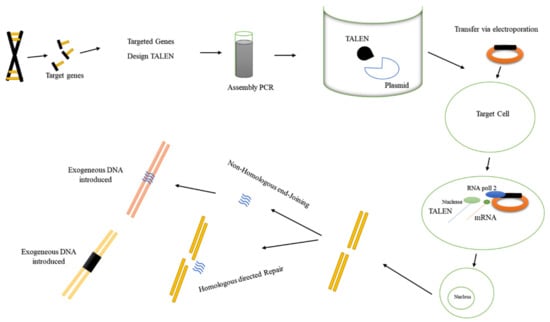 Generally, TALE proteins can be modulated by binding DNA repeated sequences. Previous studies showed that the nucleotides of the DNA sequence are fixed by the help of TALE proteins always at the 5′ end thymidine base. In the absence of a 5′T, the activities of TALE transcription factors (TALE-TFs) and TALE recombinase (TALE-R) are decreased []. TALENs are preferred over ZFNs because their modulation is much simpler and cost effective, with a much lower off-target rate (Table 1).