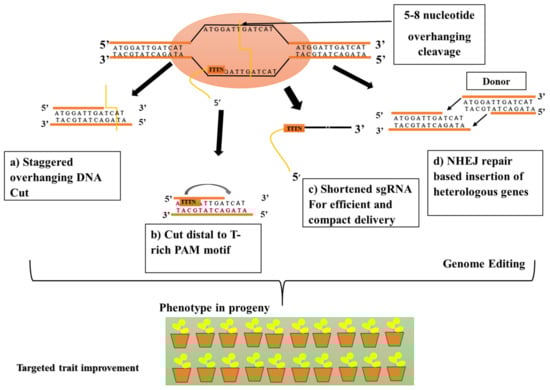 Based on the revolution of molecular biology and the discovery of sequences in the microbial immune system, biotechnologists are now able to manipulate the genome of organisms of interest in a specific and precise way with the aid of CRISPR and its associated Cas proteins. This remarkable genome-editing system is categorized into two broad classes and six subtypes. CRISPR class II has a type V effector termed Cpf1, which can be designed using highly specific CRISPR RNA to cleave the corresponding DNA sequences [,]. Cpf1 has various distinct features, such as the ability to target T-rich motifs, the absence of a requirement for trans-activating crRNA, the versatile capacity to induce a staggered double-strand break, and the potential for both RNA processing and DNA nuclease activity; hence, it represents an alternative to Cas9 [].