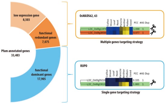 Recently, we developed a web tool to estimate the functional redundancy of rice genes, because more than 60% of the rice genome has multiple members in the same gene family, as assessed based on Pfam annotation. Functional redundancy associated with gene-family members is one of the main obstacles to crop improvement through gene-editing mediated by a loss-of-function method. Although a gene-editing system involving multiple genes was established in plant species, the editing of multiple genes at a time is generally a complex process. To achieve multiple-gene editing more effectively, we need to select candidate genes with functional redundancy more precisely by considering both protein sequence similarity and coexpression patterns among homologs. Although homologous genes account for more than half of genomes, 7075 out of 33,483 rice genes composing 2617 Pfam gene families retained a Pearson’s correlation coefficient (PCC) value of >0.7 for meta-expression data of anatomical samples, which suggests the existence of other genes with similar function; moreover, 8503 genes exhibited a very low level of expression, which hampers the estimation of their function based on expression data. Therefore, 46.5% of rice genes with gene-family members might not be suitable targets for gene-editing applications using a single target. In addition, the 7075 genes with other family members in the genome having higher similarity in both sequence and expression patterns are more probable targets for multiple-gene editing (Figure 6) []. For example, OsMADS63 genes, which share expression in mature pollen with OsMADS62, did not yield a defect in pollen development, whereas multiple mutations of OsMADS62 and OsMADS63 with a PCC of 0.977 caused a severe defect in late pollen development, and RUPO mutation (PCC, 0.335) over LOC_Os03g55210 in the same family led to a severe defect in late pollen development and did not require multiple-gene editing. Therefore, accurate estimation of gene redundancy within a family will accelerate crop improvement through gene-editing systems. This web tool (CAFRI-Rice, http://cafri-rice.khu.ac.kr/) is only available for rice, but we expect its expansion to other crop species [].