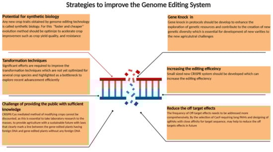 The CRISPR technology can classify any new crop traits in the category of plant synthetic biology (Figure 7). In our opinion, the saturation mutagenesis induced by CRISPR could be used to develop any desired plant protein when a proper selection tool is available. The use of this “faster and cheaper” method of evolution to optimize the role of metabolic enzymes in traits, such as crop production, quality, and disease resistance, should accelerate crop development; however, the CRISPR-associated technology would need to be strengthened. For example, improvements in the transformation methods and delivery of CRISPR/Cas agents to target cells will enable CRISPR in different tissues, including germline cells, and will increase the compatibility of plant species. However, the off-target issue is a big challenge in the application of gene-editing technology and a recent whole-genome sequencing analysis of CRISPR/Cas9-edited cotton plants revealed rare off-target mutations []. The detailed strategy to increase on-target and reduce off-target effects of CRISPR/Cas9 was recently well reviewed []. Targeted genome editing in rice using chemically modified donor DNA, which are designed for UTR or prompter region and the homology-directed repair method, was successful [] and further improvements are expected in the future. Creating a large population of CRISPR/Cas9-driven mutagenesis of promoters for developmental genes of tomato contributes to increased genetic variations []. It is reasonable to expect that the development of various precision genome-editing technologies for targeted and precise gene/allele replacement, in combination with conventional breeding practices, will expedite the breeding of diverse elite crop varieties for the development of sustainable agriculture.