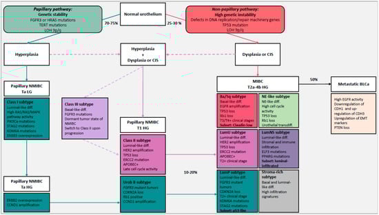 Histological and cytogenetic analysis of BLCa tumors revealed that low-grade NMIBC tumors had few cytogenetics changes, while MIBC tumors were more genetically unstable [67]. Therefore, based on the fact that NMIBC and MIBC tumors present with different clinical behavior, histology and evolution, two distinct carcinogenic pathways, the papillary and the non-papillary pathway, have been proposed. The papillary pathway includes hyperplasia which will give rise to low-grade NMIBC; in the non-papillary pathway, instead, flat dysplasia and/or CIS are believed to be the precursors of MIBC tumors. However, high-grade NMIBCs seem to derive from the co-occurrence of hyperplasia and dysplasia, thus suggesting that the two-pathways intersect.