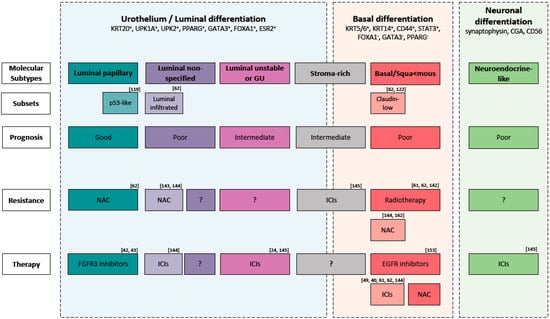 The mechanisms of resistance of MIBC to systemic treatment are largely unknown and molecular biomarkers for the selection of effective second-line treatments are currently lacking. A one treatment fits all approach for such a highly heterogeneous disease is certainly a limiting factor. Stratifying patients into “subtypes” based on the molecular landscape can be used to predict the response to treatment [61,62,63]. BLCa can be grouped into at least two molecular subtypes: basal/squamous-like and luminal subtypes, and some of these subtypes were associated with therapy response. McConkey and colleagues employed gene expression profiles of NAC-treated MIBC tumors to predict therapy response. They showed that basal tumors were associated with better survival in the context of NAC and that tumors expressing wild-type (WT) p53-associated gene expression (p53-like subtype) were associated with bone metastasis and chemo-resistance [61]. In a retrospective study, Seiler and colleagues investigated the association between molecular subtypes and the response to NAC. They proposed four molecular subtypes (Basal, Claudin-low, luminal and luminal-infiltrated subtypes) that can predict NAC response and confirmed that basal tumors were more chemo-sensitive and benefited the most from NAC compared to cystectomy only. In addition, they showed that irrespective of the treatment, the luminal subtype had better overall survival. On the contrary, the claudin-low subtype, defined as a subset of basal tumors with (1) a decreased expression of claudin-3 and claudin-4, (2) an enrichment for tumor-initiating cells (TIC) signatures and (3) an over-expression of epithelial-mesenchymal transition (EMT) transcription factors (e.g., SNAI1, TWIST1), had the worst overall survival and did not profit from NAC [62]. In the context of immunotherapy, ICIs are effective only in a subset of patients (20–25%) [39,40,41]. Mariathasan and colleagues performed transcriptomic analysis of a cohort of MIBC tumors treated with atezolizumab, an anti-PD-L1 drug. The responders were correlated with high neoantigen or tumor mutation burden, and with infiltration of CD8+ T-effector cells. Non-responders were correlated with a gene expression signature of transforming growth factor β (TGF-β) signaling in fibroblast, especially in cases where CD8+ T-effector cells were only present in the peritumoral stroma and not in the tumor parenchyma [63]. However, clinical trials testing these stratifications of patients into “subtypes” are needed.