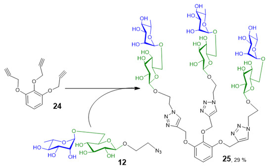 Click reactions were performed using the standard protocol comprising sodium ascorbate and CuSO4 in methanol/water at 60 °C, for 72 h. Interestingly, the reaction with rutinosyl azide (11) did not show any notable conversion, probably due to the steric hindrance caused by the lack of a spacer between the carrier and the rutinosyl moiety. In contrast, the reaction with 2-azidoethyl rutinoside (12) yielded the multivalent glycoconjugate 25 (Figure 2). Compound 25 was isolated in a final yield of 29%.