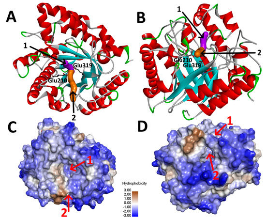 Tunnels leading to the active site of AnRut protein (PDB ID: 6I1A). (A,B) Main (magenta) and side (orange) tunnels within the ribbon model, the active site residues Glu319 and Glu210 are shown as stick models; (C,D) The views of the main (1) and side tunnels (2) within the hydrophobic surface model.