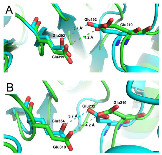 Overlay of the AnRut catalytic active site (green) with (A) exo-β-(1,3)-glucanase (blue) from Candida albicans (CaExg) or with (B) exo-β-(1,3)-glucanase (blue) from Saccharomyces cerevisiae (ScExg). Distances between active site residues Glu210 and Glu319 of AnRut (3.7 Å) and the corresponding residues (A) Glu192 and Glu292 (4.2 Å) in CaExg and (B) Glu232 and Glu334 (4.2 Å) in ScExg are displayed. Despite the low sequence identity of ca 20%, a high structural similarity between AnRut and both exo-β-(1,3)-glucanases was found in their catalytic sites.
