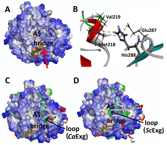 The structural similarity of AnRut, CaExg, and ScExg in the area of deep valley leading to the protein active site (AS). (A) Surface model of AnRut protein colored by hydrophobicity with a deep bridged valley indicated by a red arrow; (B) View of the bridge residues of AnRut, which span the valley via non-covalent interactions caused by the presence of His288 (His288-Val219 via π-alkyl, His288-Met218 via van der Waals, and His288-Glu287 via π-anion interactions); (C) Hydrophobic surface model AnRut superimposed into CaExg tube model revealing the existence of a flexible loop in CaExg (Glu314-Ile323) over the valley; (D) Hydrophobic surface model of AnRut superimposed into ScExg tube model revealing the existence of a large loop in ScExg (Gly357-Cys372) over the valley.
