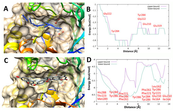 Selected snapshots of (A) the best (azide, 4) and (C) the worst (4-methylumbelliferone, 9) acceptors passing through the second tunnel of AnRut. At a specific point close to the entry to the tunnel, most acceptors form a temporary hydrogen bond with the peptide carbonyl of Gly222 residue (2.2 Å distance). Thus, Gly222 could be the major driving force attracting the acceptor molecule and dragging it into the tunnel. The respective energy profiles of acceptor passages are shown in panels (B) (for 4) and (D) (for 9). The lower-bound trajectory (green) is not contiguous; however, it samples the tunnel without any gap in the substrate movement and some bottlenecks may not be detected. The upper-bound trajectory (magenta) is contiguous, it is the best trajectory found; however, a trajectory with better energy profile may exist, the actual energy would then be the same or lower. During the acceptor (azide, 4 or 4-methylumbelliferone, 9) passage through the side tunnel, non-covalent interactions of amino acid residues (indicated in red in panels (B,D)) with respective acceptors were monitored.