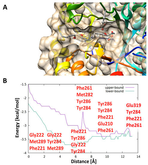 (A) Selected snapshots of aliphatic acceptor (pentanol, 3), passing through the second tunnel to the active site of AnRut protein; (B) binding energy profile of acceptor 3 passing through the side tunnel. During the acceptor passage through the side tunnel, the non-covalent interactions of amino acid residues (indicated in red in panel (B)) with acceptor 3 were recorded.