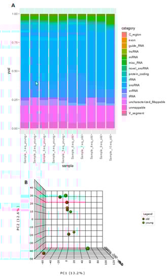 To identify differential expression of sncRNAs in ageing, Illumina MiSeq was utilised. Summaries of raw, trimmed reads, and mapped reads to Equus caballus database can be found in File S2. Reads mapping percentages were between 92 to 94.3%. There were 2128 sncRNAs identified. The categories of non-coding RNAs identified are in Figure 1A and File S3 and included miRNAs, snoRNAs, novel snoRNAs, tRNAs, snRNAs, and long non-coding RNAs (lncRNAs).