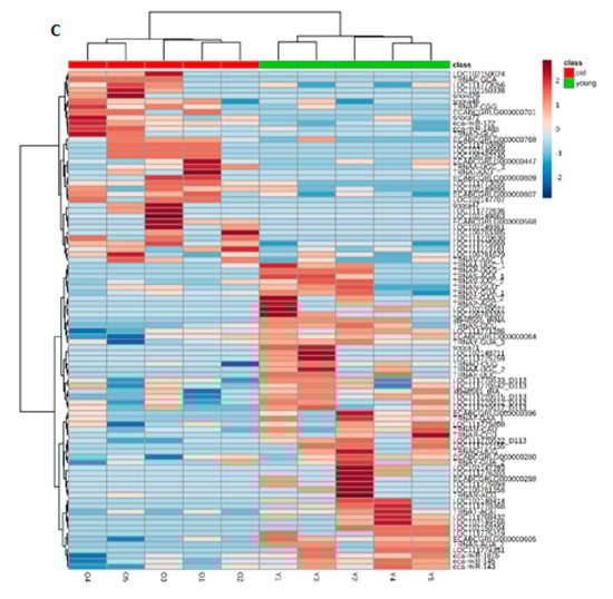 There were no overall differences in the distribution of classes of sncRNAs in ageing. The effect of age on the expression of sncRNAs was weak and the separation of young and old samples was not clear. The 3D PCA plot (Figure 1B) indicated that few, but very specific changes in the expression of sncRNAs were found, and samples from old donors were more variable than those from young. A heat map of hierarchical clusters of correlations among samples (Figure 1C) depicts that the sncRNA expression of young and old groups are not very different.