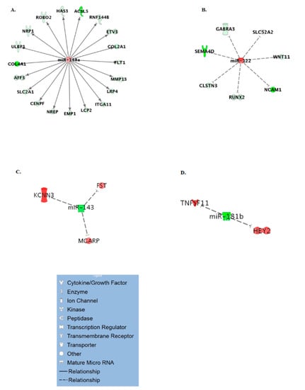miR-mRNA interactome for differentially expressed miRs in ageing. Significantly differentially expressed miRs were paired with differentially expressed mRNAs from our original cartilage study. (A) miR-148a, (B) miR-122, (C) miR-143, (D) miR-181b. The legend for individual molecules is shown. Genes in red are upregulated and green downregulated in old chondrocytes/cartilage compared to young, and depth of colour correlates to fold expression change.