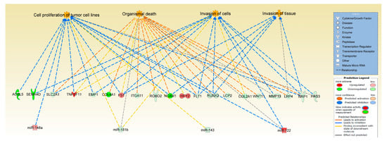 To generate an age-specific miRNA interactome of the most likely miRNA-mRNA target pairs, analysis was performed to identify miRNA targets of the five differentially expressed miRNAs from this study. In IPA, the five miRNAs (miR-143, miR-145, miR-181b, miR-122, miR-148a) were paired with 351 protein coding genes differentially expressed in our previous RNA-seq study on ageing equine cartilage []. In File S4, the miRNA-mRNA pairings in the correct direction (miR increase and mRNA decrease or vice versa) are shown, including the target predictions and /or experimental validation in the respective database. Four of the five miRNAs interacted in IPA with 31 different differentially expressed target genes reflecting that miRNAs target many mRNAs. These mRNAs targeted by the miRNAs were used in IPA as network-eligible molecules and overlaid onto molecular networks based on information from the IPA Database. Networks for the four miRNAs (miR-148a, miR-122, miR-143, and miR-181b) were generated based on connectivity (Figure 2A–D). Interesting age-related features were determined from the gene networks inferred. Among the top canonical pathways were hepatic fibrosis (p = 1.51 × 10−3), glycoprotein 6 (GP6) signalling (p = 5.67 × 10−4), and osteoarthritis pathway (p = 2.93 × 10−3). The top diseases and cellular functions associated with this network are shown in Table 2 and Figure 3. All IPA results are in File S5.