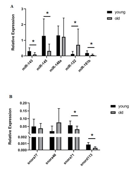 Validation of selected sncRNAs in an extended cohort of equine young and old chondrocytes. Real-time quantitative Polymerase Chain Reaction (qRT-PCR) was used to validate findings from the small RNA sequencing (A) microRNAs and (B) snoRNAs, n = 5–12 per group. Statistical analysis was undertaken using a Mann Whitney test in GraphPad Prism. Mean and standard errors are shown with * denoting p < 0.05.