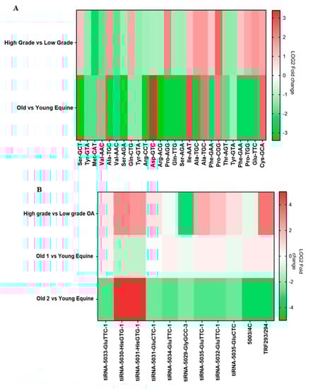 In both human and equine samples, 26 parent tRNAs were detected. Of these 26 tRNAs, 13 tRNAs were induced and 13 were reduced in cartilage from high grade OA compared to cartilage from low grade OA. In equine chondrocytes, 6 parent tRNAs were expressed higher and 20 parent tRNAs were expressed lower in old samples compared to young. Four parent tRNAs were induced in both high grade OA cartilage compared to low grade OA cartilage and in old versus young equine samples. Eleven parent tRNAs were reduced in high grade OA cartilage compared to low grade OA cartilage and in the old versus young equine samples (Figure 6A).