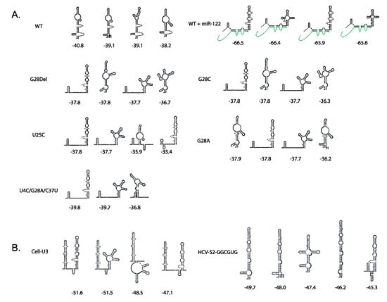 - Amador-Cañizares, Y.; Panigrahi, M.; Huys, A.; Kunden, R.D.; Adams, H.M.; Schinold, M.J.; Wilson, J.A. miR-122, small RNA annealing and sequence mutations alter the predicted structure of the Hepatitis C virus 5′ UTR RNA to stabilize and promote viral RNA accumulation. Nucleic Acids Res. 2018, 46, 9776–9792. [Google Scholar] [CrossRef] [PubMed]