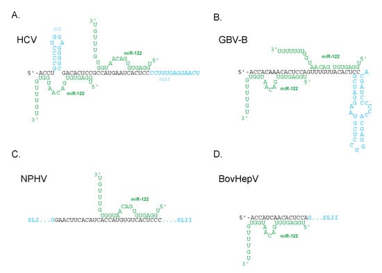 - Gerresheim, G.K.; Dünnes, N.; Nieder-Röhrmann, A.; Shalamova, L.A.; Fricke, M.; Hofacker, I.; Höner Zu Siederdissen, C.; Marz, M.; Niepmann, M. microRNA-122 target sites in the hepatitis C virus RNA NS5B coding region and 3′ untranslated region: Function in replication and influence of RNA secondary structure. Cell. Mol. Life Sci. CMLS 2017, 74, 747–760. [Google Scholar] [CrossRef] [PubMed]