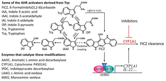 The species of commensal bacteria that have so far been shown to produce indoles that activate the AHR include certain strains of Lactobacillus, Allobaculum, Peptostreptococcus, and Propionibacterium [20,48,51,52]. However, many other such species are likely to be identified, since the common bacterial inhabitants of the gut, belonging to several different phyla, convert Trp into I3P, Tra, or IAAl [42,44,53], all of which are precursors of FICZ and other AHR-activating indoles as well (Figure 1).