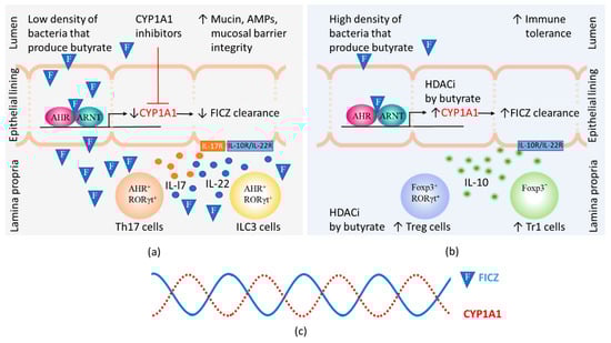 The steady-state levels of 6-formylindolo[3,2-b]carbazole (FICZ) influences gut immunity. The amount of FICZ (illustrated by an F in a blue triangle) that reaches the lamina propria depends on the CYP1A1 activity in the epithelial lining, which is modified by the presence of CYP1A1 inhibitors. Butyrate can by virtue of its histone deacetylase inhibitory function (HDACi) contribute to increased numbers of Foxp3 positive and negative regulatory T cells (Treg and Tr1 cells) as well as increased CYP1A1 expression in intestinal epithelial cells. (a) At low levels of butyrate, heightened immunity is promoted by CYP1A1 inhibitors that cause FICZ to reach lamina propria and stimulate IL-22 and IL-17 expression in Th17 and ILC3 cells. Binding of IL-17 and IL-22 to their receptors on epithelial cells stimulate increased production of mucins and antimicrobial peptides (AMPs); (b) At high levels of butyrate, high CYP1A1 activity promotes the clearance of FICZ. Immunity is suppressed and Treg and Tr1 cells produce IL-10 that helps maintain tolerance to commensal bacteria by binding to receptors on epithelial cells; (c) Daily 24 h cycles in the CYP1A1 activity and the levels of FICZ.