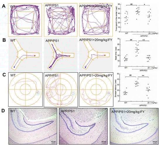 Compared with the wild type (WT) mice, the memory loss and behavioral cognitive impairment were noted in APP/PS1 mice. Meanwhile, IFY significantly reduced the time spent in the central area of the open filed test (p < 0.05 (Figure 2A)), the searching time for food in the Y maze test (p < 0.01 (Figure 2B)), and the searching time for the platform in the Morris water maze (MWM) test (p < 0.01 (Figure 2C)). Among all groups including WT mice, APP/PS1 mice, and IFY-administered APP/PS1 mice, no significant changes were noted in brain tissues (Figure 2D) and other organs including the spleen, liver and kidney (Figure S2).