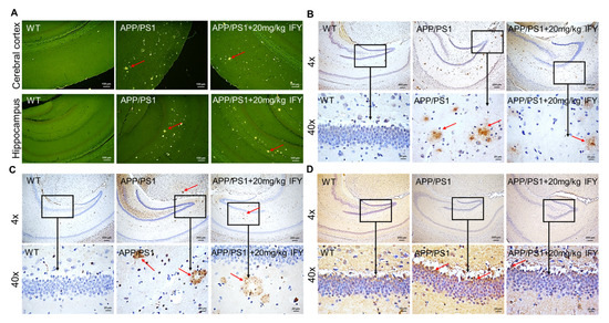 Aβ aggregation and the hyper-phosphorylated tau protein are prominent features of AD patients [21]. Sensible plaques formed by Aβ aggregation were observed in APP/PS1 mice; however, the number of spots was reduced in IFY-treated APP/PS1 mice. The results were confirmed by thioflavin S staining (Figure 3A). The amyloid plaques in the brain cortex and hippocampus of APP/PS1 mice were strongly reduced after IFY treatment (Figure 3B). NFTs caused by hyper-phosphorylated tau are clearly visible in the brain of APP/PS1 mice, which were strongly suppressed in IFY-treated mice (Figure 3C). One of the main products of lipid peroxidation is 4-hydroxynonenal (4-HNE), which is significantly enhanced in the pathological process of AD [22]. In APP/PS1 mice, IFY significantly reduced the content of 4-HNE in the brain area (Figure 3D).