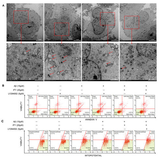 A 24-h IFY exposure relieved the mitochondrial swelling, crest rupture and increased the electron density of U251 cells damaged by Aβ1-42 (Figure 6A). As the synthetic PI3K inhibitor, LY294002 alone failed to influence the cell viability (Figure S3), apoptosis rate (Figure 6B) and MMP levels (Figure 6C) in Aβ1-42-exposed U251 cells. In contrast, LY294002 co-incubation abolished the protection of IFY against Aβ1-42-caused cell viability reduction (p < 0.001 (Figure S3)), cell apoptosis (Figure 6B) and MMP dissipation (Figure 6C).