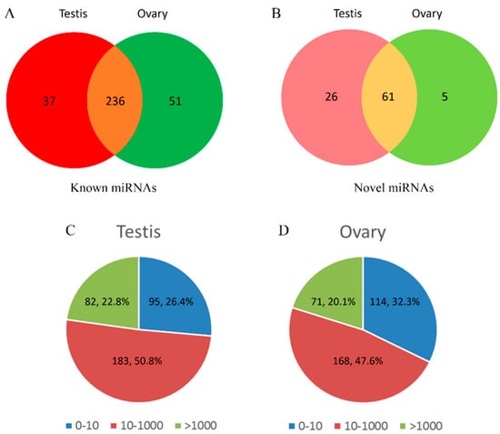 Overview of microRNA (miRNA) expression characteristics. Distributions of known miRNAs (A) and novel miRNAs (B) between the testis and the ovary. Read distribution intervals and the corresponding proportions in the testis (C) and the ovary (D).