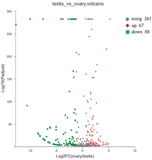 Volcano plot showing the miRNAs differentially expressed between the testis and the ovary. The ovary-biased miRNAs and testis-biased miRNAs are shown as red and green dots, respectively, whereas the miRNAs not differentially expressed are shown as gray dots.