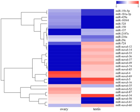 Hierarchical clustering of the 30 most differentially expressed miRNAs between the testis and the ovary. Heatmaps are used to identify differences in expression patterns. Blue, white, and red represent the low-, middle-, and high-frequency miRNAs sequenced in the library, respectively.