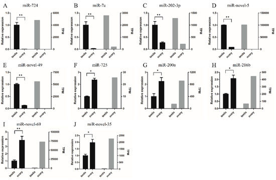 To validate the transcriptome data, we selected five testis-biased miRNAs (miR-724, miR-7a, miR-202-3p, miR-novel-5, and miR-novel-49) and five ovary-biased miRNAs (miR-725, miR-216b, miR-200a, miR-novel-35, and miR-novel-69) for RT-qPCR analysis. The RT-qPCR results indicated that miR-724, miR-7a, miR-202-3p, miR-novel-5, and miR-novel-49 were more highly expressed in the testis than in the ovary. Conversely, miR-725, miR-216b, miR-200a, miR-novel-35, and miR-novel-69 were more highly expressed in the ovary than in the testis (Figure 5). These results were consistent with our small RNA-seq results, indicating that our sequencing results were reliable.