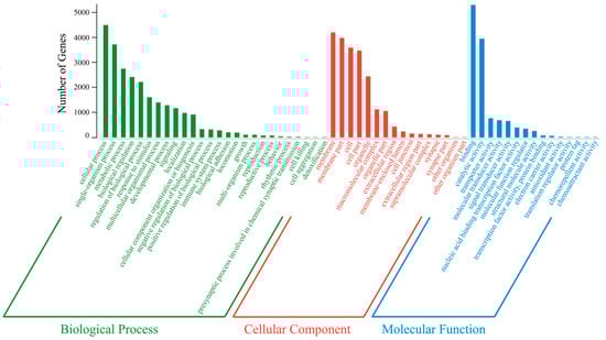 The Gene Ontology annotations of the predicted target genes of the DE miRNAs. The 57 subcategories are plotted on the x-axis, while the number of genes in a specific functional cluster are shown on the y-axis.