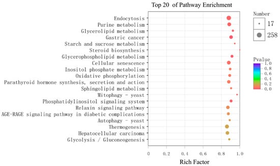 Bubble plot showing the 20 most enriched KEGG (Kyoto Encyclopedia of Genes and Genomes) pathways. The x-axis shows the rich factor, while the y-axis indicates the KEGG pathway terms.