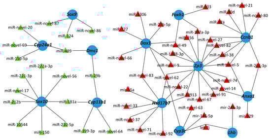 Regulatory network showing interactions between sex-related target genes and DE miRNAs. The testis- and ovary-biased miRNAs are represented by red and green triangles, respectively, while the sex-related target genes are represented by blue circles.