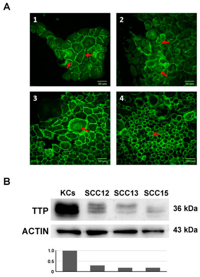 Immunofluorescence highlighting CTNNB1 localization and immunoblotting of ZFP36 expression. Panel (A) shows confocal microscope images of healthy keratinocytes (panel (A(1))) and SCC12, SCC13 and SCC15 (Panels (A(2)), (A(3)) and (A(4)) respectively). Scale bars 30 µm, 50 µm and 100 µm. Panel (B) shows the western blot analysis of TTP expression in the three SCC cell lines compared to normal keratinocytes. The plot below indicates the normalized densitometric analysis of immunoblot.