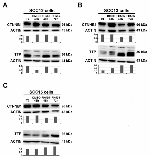 CTNNB1 (96 kDa) and TTP (36 kDa) expression in SCC cell lines treated with FH535, inhibitor of Wnt/CTNNB1 signal pathway. T0 refers to the beginning of the treatment with FH535 or DMSO, respectively. Analysis of the treatment was performed at 48 and 72 h by Western Blot. In the panels (A–C) show expression of CTNNB1 and TTP in SCC12, SCC13 and SCC15 respectively. The plot below indicates the normalized densitometric analysis of immunoblot.