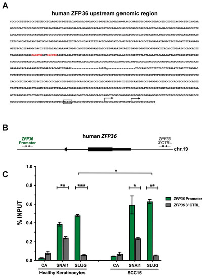 Chromatin immunoprecipitation assays were performed as previously described [34]. Briefly, chromatin from human keratinocytes and human SCC15 cell line was crosslinked with 1% formaldehyde and subjected to immunoprecipitation with 5 μg anti-SNAI1 (AF3639, R&D Systems, Minneapolis, Minnesota, USA), 5 μg anti-SLUG (C19G7) (9598S, Cell Signalling Technologies, Danvers, MA, USA) whereas 5 μg of normal mouse IgG (sc-2025, Santa Cruz Biotechnology, Santa Cruz, CA, USA) were used as control antibody (CA). The enrichment of the amplified genomic region in immunoprecipitates was evaluated by quantitative real-time PCR (qPCR) and calculated as a percentage of total input chromatin. Mean enrichments for each ChIP were assessed using three independent experiments. Primers used in qPCR analysis were: ZFP36-Prom Fw_: 5′-AGGGTTTTCACTTAGGGCGA-3′; ZFP36-Prom Rev_: 5′-TTAGTCAGGCTGGTCACGAA-3′; ZFP36-3′CTRL Fw_: 5′-GCTCCTTGACCCAGCTTCGG-3′; ZFP36-3′CTRL Rev_: 5′-ACATTCCGTCCTCCCCACCC-3′. Statistical analysis (t-test) was performed with Prism GraphPad version 8.0, San Diego, CA, USA [34].