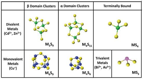 Binding motifs of mammalian metallothioneins. Ball and stick structures depict MT binding monovalent, divalent, and trivalent metals (blue, green, and pink, respectively) as clusters in the β and α domains and as terminally bound to the cysteine thiols (yellow). Adapted from References [57,58,59,60,61]. Excluded are plant metallothionein clusters, which are significantly more varied in structure [45].