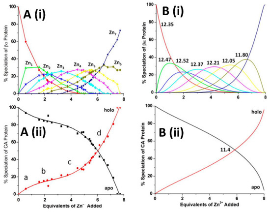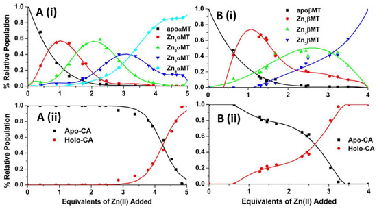 (A) Experimentally determined speciation of the competitive zinc metalation of apo-αMT domain fragment A(i) in the presence of apo-CA, and A(ii) extracted experimental speciation profiles from deconvoluted electrospray ionization (ESI)-mass spectral data, recorded during the competitive zinc titration of equimolar mixtures of apo-αMT and apo-CA at pH 7.0. Sequential metallation steps are represented by coloured lines A(i): apo-MT (black), Zn1 (red), Zn2 (green), Zn3 (blue), and Zn4 (cyan). The fraction of each species has been plotted according to the stoichiometry of the zinc added. An equivalent means zinc added for one metal-binding site. The lines are the predicted speciation based on the series of fitted KF’s shown graphically in Figure 5. Reproduced with permission from American Chemical Society, 2015, Reference [121]. B(i) Experimentally determined speciation of the competitive zinc metalation of apo-βMT domain fragment in the presence of apo-CA (black lines) and the subsequent formation of holo-CA (red lines). B(ii) Extracted experimental speciation profiles from the deconvoluted ESI-mass spectral data recorded during the competitive zinc titrations of equimolar mixtures of apo-βMT and apo-CA at pH 7.0. The fractional presence of each species has been plotted according to the stoichiometry of the zinc added. An equivalent means one metal-binding site. The lines have no theoretical significance. Reproduced with permission from Portland Press, Reference [121].