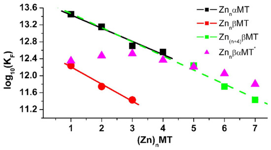 Comparison of the calculated zinc affinity constants for zinc binding to αMT1A (black) and βMT1A (red). The symbols show the calculated binding constants from the data in Figure 3 and Figure 4. The green dashed line shows the predicted linear trend for the β-fragment affinities shifted by four to illustrate the expected linear trend for connected fragments. * Affinity data for the zinc binding to the intact βαMT taken from Reference [120]. Reproduced with permission from Portland Press, Reference [121].