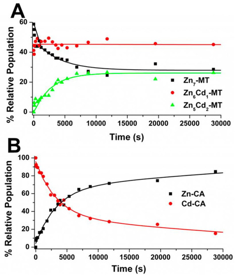 Time course of the metal exchange between Zn7-MT and Cd-CA. (A) MT and (B) CA. Species were extracted from the ESI-mass spectral data of the reaction between an equimolar (30 μM) mixture of Cd-CA and Zn7-MT. The lines are calculated from the fitted rate constant, k = 6.0 ± 0.5 M−1 s−1 (at 37 °C, pH 7.0). Conditions: 5 mM ammonium formate, pH 7.0, 37 °C. Reproduced with permission from American Chemical Society, 2015, Reference [125].