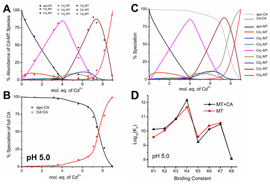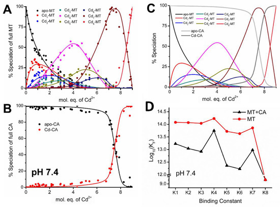 Comparison of the rates of Cd2+ metalation of apo-MT as a function of pH and the presence of apo-CA and various mole equivalents (mol. eq.) of Cd2+added (A,B) compare metalation at pH 7.4 show that the rate of Cd2+ metalation of apo-MT is significantly slower in the presence of apo-CA. (C,D) at pH 5.0 show no difference in metalation rate with or without apo-CA present. Reproduced with permission from Royal Society of Chemistry, 2020, Reference [127].