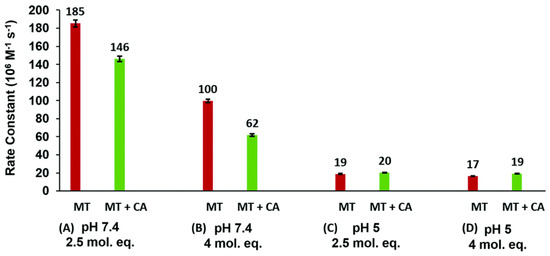 Stopped-flow methods combined with UV-visible absorption spectroscopy were used to study the kinetics of Cd2+ binding to apo-MT in the presence and absence of CA at pH 5.0 and 7.4 to investigate the possible interactions of MT and CA seen in the ESI-MS results [127].