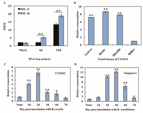 RNA-Seq and qRT-PCR analyses on transcriptional profiles of TaCRR1 in the wheat responses to Rhizoctonia cerealis and Bipolaris sorokiniana. (A) RNA-Seq data of TaCRR1 transcription in the resistant RILs (RIL-R) and in susceptible RILs (RIL-S) (use the same in text as in Figure 1A). (B) Transcription of TaCRR1 in stems, leaves, sheaths, and spikes of CI12633 plants. The transcriptional level of TaCRR1 in spikes was set to 1. (C) qRT-PCR analysis of TaCRR1 in the resistant wheat Yangmai 6 plants inoculated with B. sorokiniana. (D) qRT-PCR analysis of TaCRR1 in the resistant wheat cv. CI12633 plants inoculated with R. cerealis. The transcriptional level of TaCRR1 at none (non-treatment) is set to 1. Statistically significant differences were derived from the results of three independent replications (t-test: * 0.01 < p < 0.05, ** p < 0.01). TaGAPDH was used as an internal control.