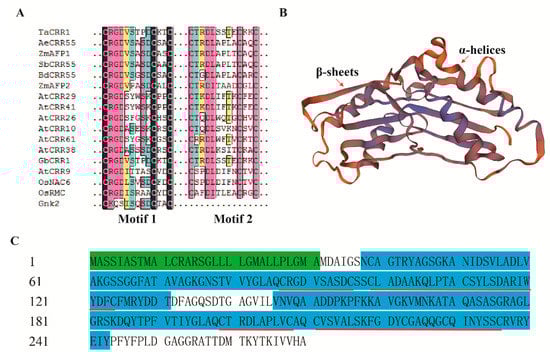 Domain and structure analyses of TaCRR1. (A) Amino acid alignment of CRR motifs between TaCRR1 and other CRR proteins. (B) The structure model of TaCRR1 protein. The structure of TaCRR1 protein was modeled using the Swiss-Model. (C) Schematic diagram of the domain (color area) and cysteine bridge of TaCRR1 protein. The green region indicated signal peptide domain; the blue region indicated DUF26 domain; the red underline indicated the cysteine bridge.