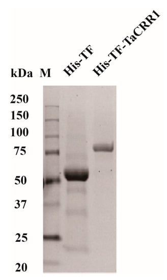 The full coding sequences of the TaCRR1 gene were sub-cloned into the BamHI site of pCOLD vector (Takara Bio Inc., Otsu, Japan) and fused with the His-Trigger Factor (His-TF) tag in the vector, which resulted in the expression vectors His-TF-TaCRR1. The positive clones with the His-TF-TaCRR1 recombinant genes were identified by means of gene-specific PCR and confirmed by sequencing of the respective genes. The resulting His-TF-TaCRR1 fusion constructs were transformed into competent cells of E. coli BL21 (DE3). The recombinant His-TF-TaCRR1 and His-TF, were separately expressed after treatment with 0.5 mM IPTG at 16 °C for 19 h, and purified using Ni-NTA resin (TransGen Biotech, Beijing, China). Protein purity and molecular weight were determined by using SDS-PAGE according to the method described by Lu et al. [].